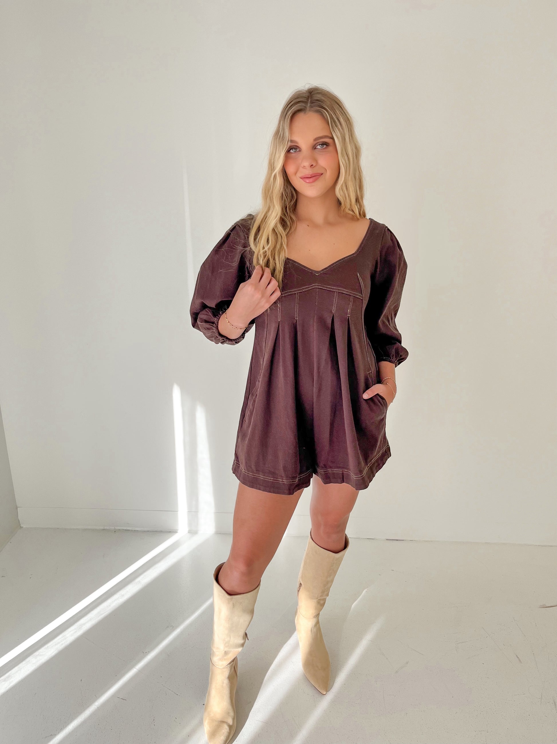 Puff 3/4 sleeve brown denim romper with contrast stitch detailing