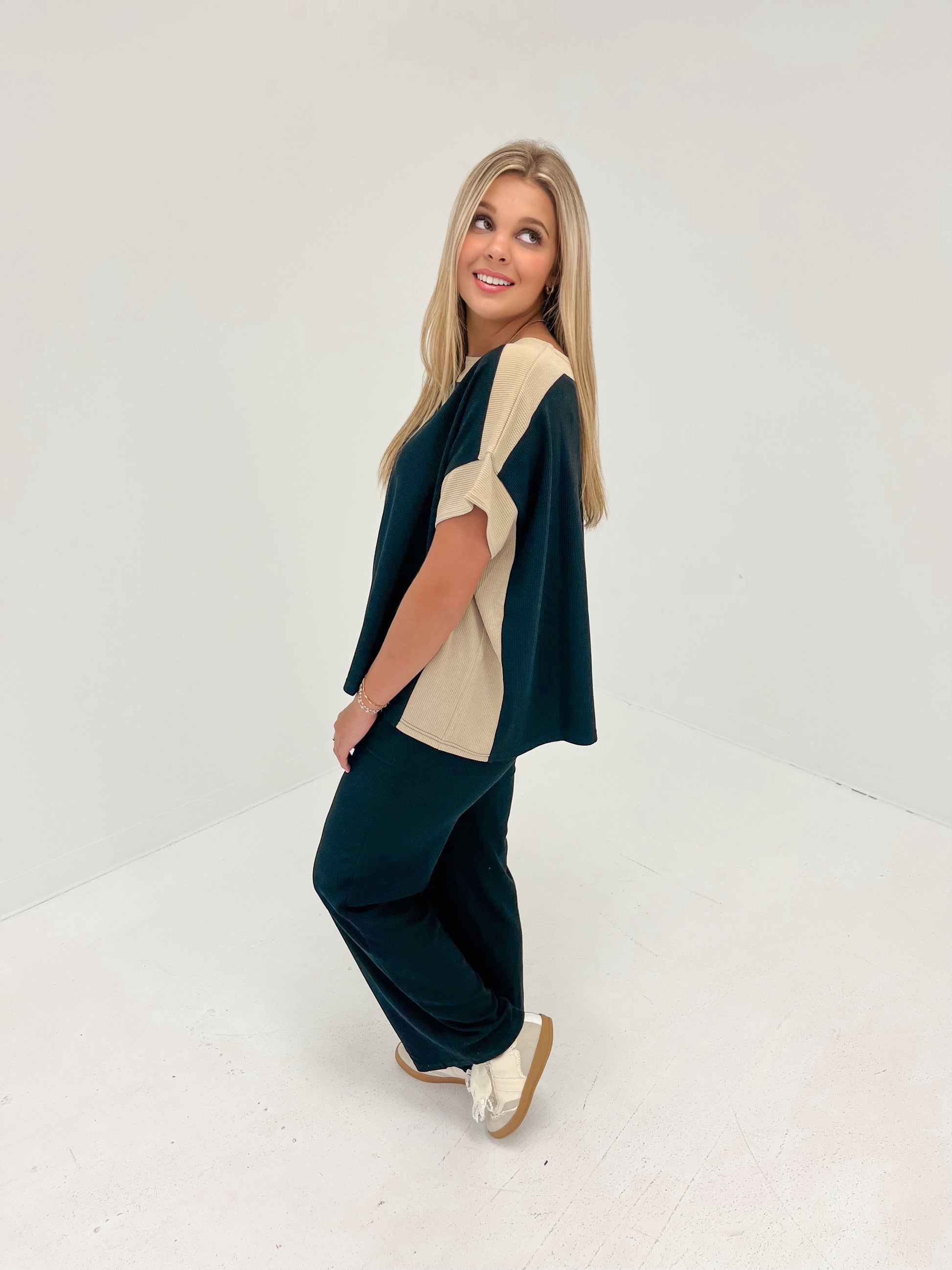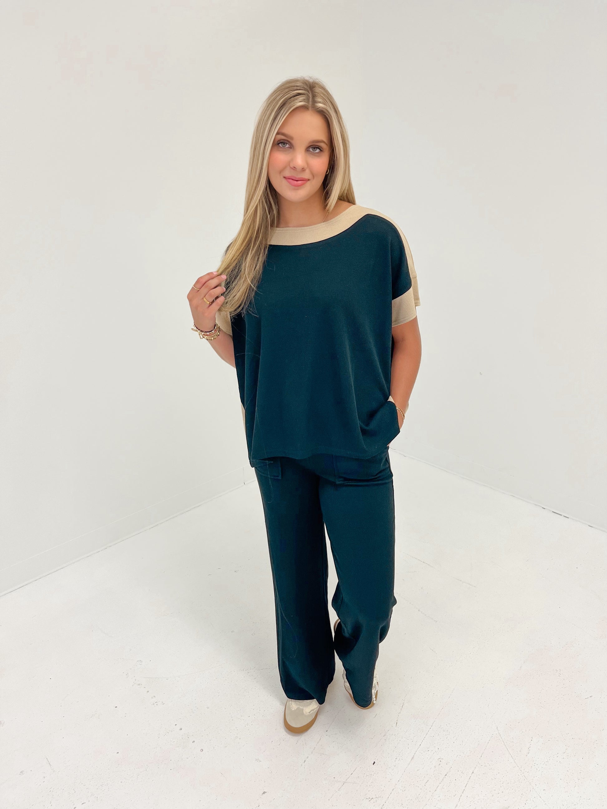 Straight leg silhouette ribbed knit texture adjustable drawstring waistband with contrast trim and two oversized front patch pocket pants in color black (matching top sold separately)