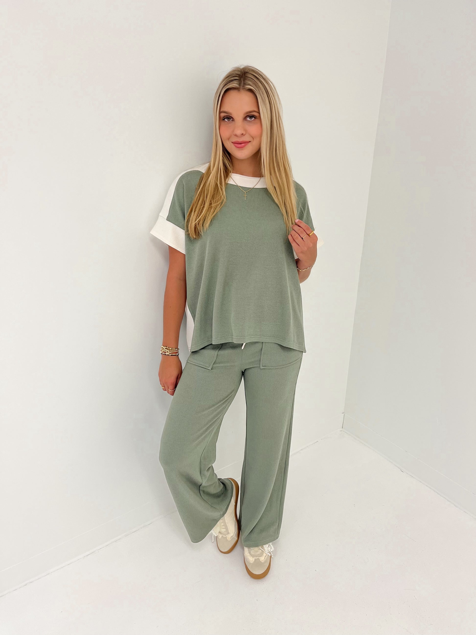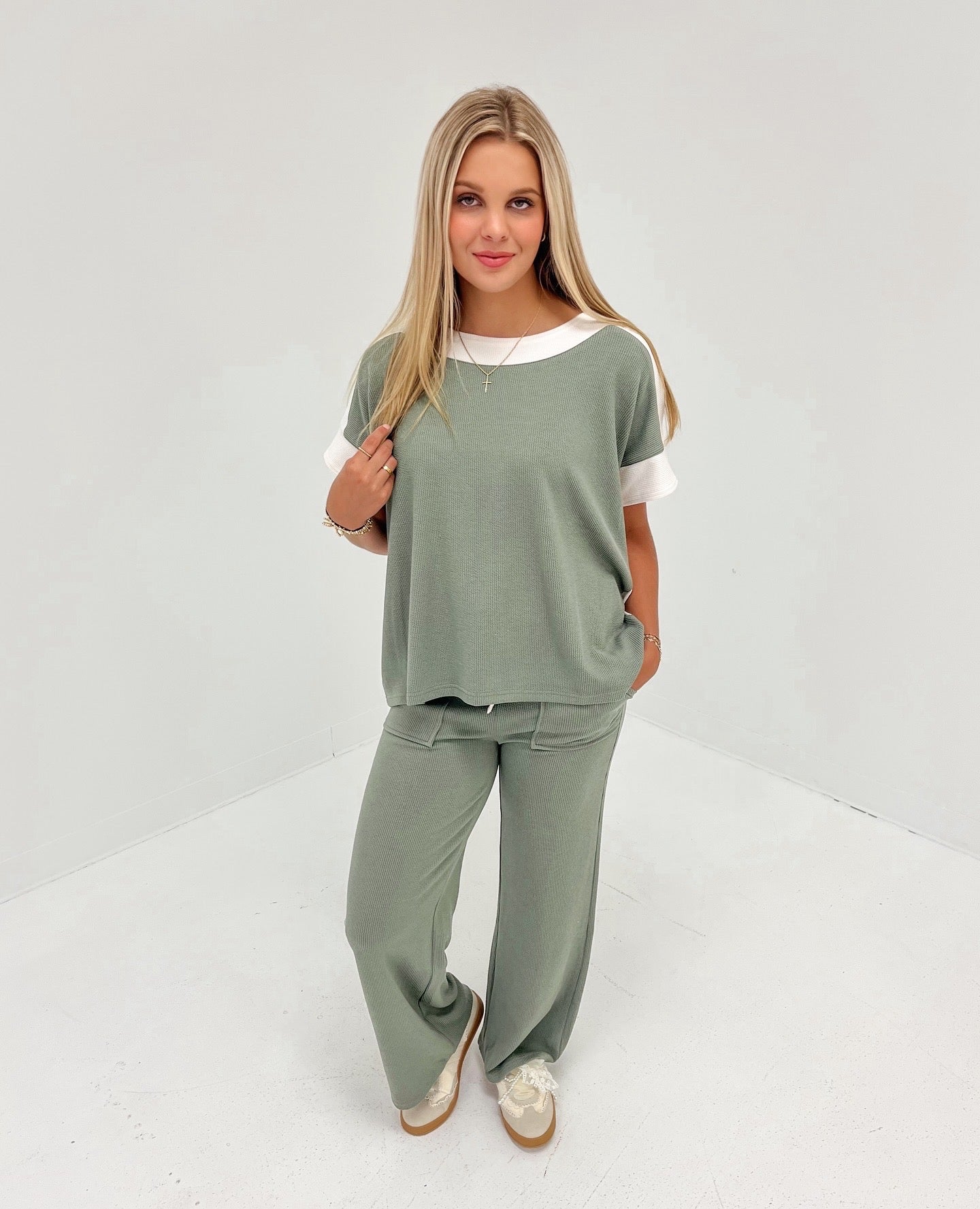 Straight leg silhouette ribbed knit texture adjustable drawstring waistband with contrast trim and two oversized front patch pocket pants in color dry herb (matching top sold separately)