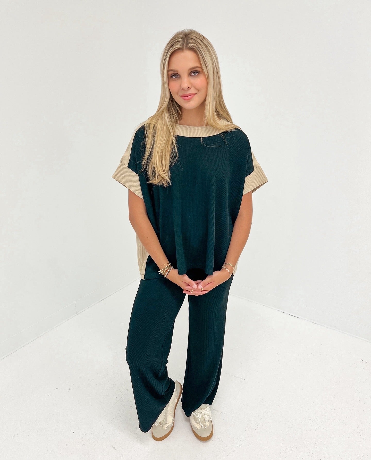Ribbed knit texture top with contrast detailing in color black (matching bottoms sold separately)