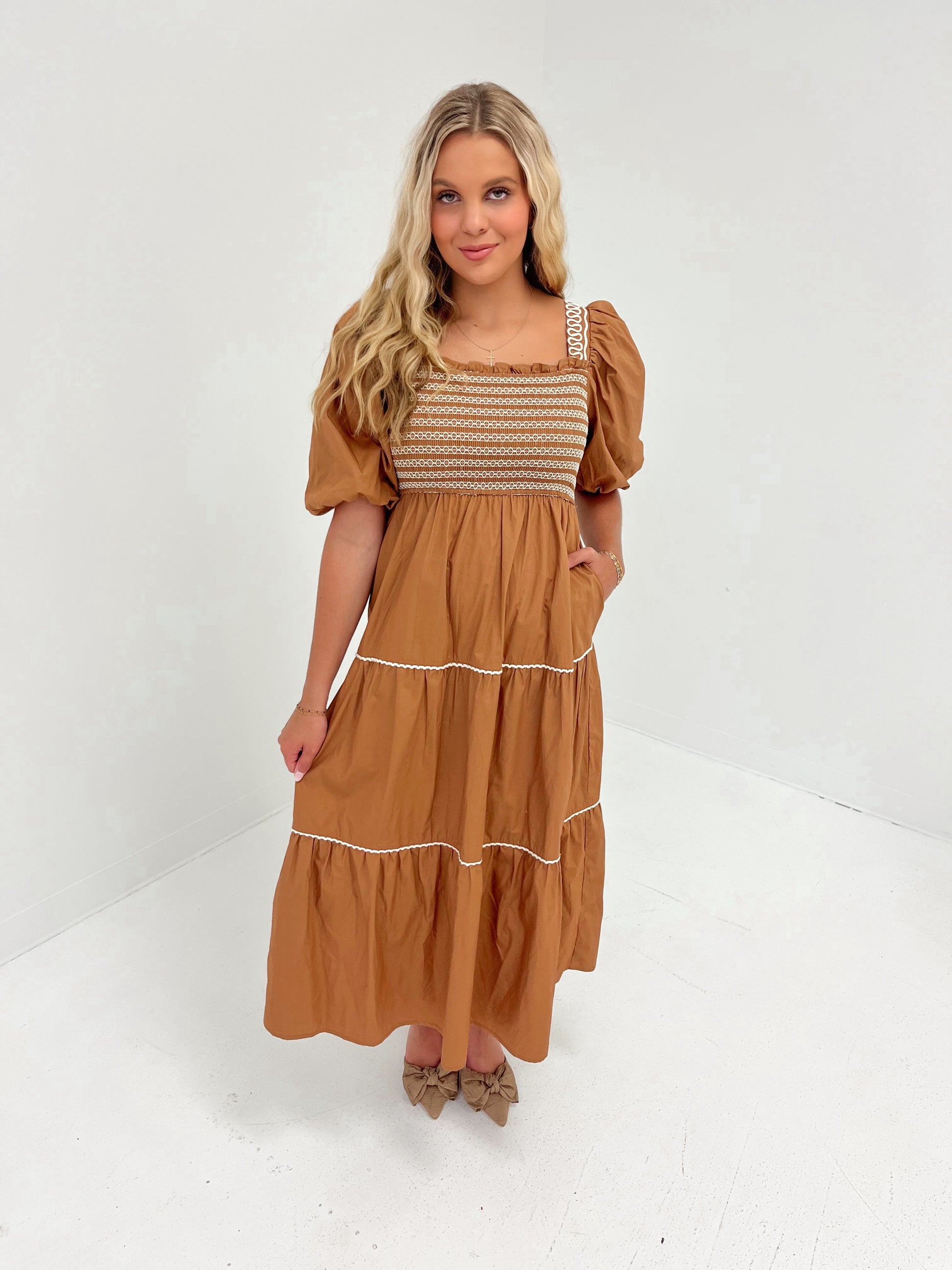 Popling smocked maxi dress with shoulder embroidery in color cinnamon
