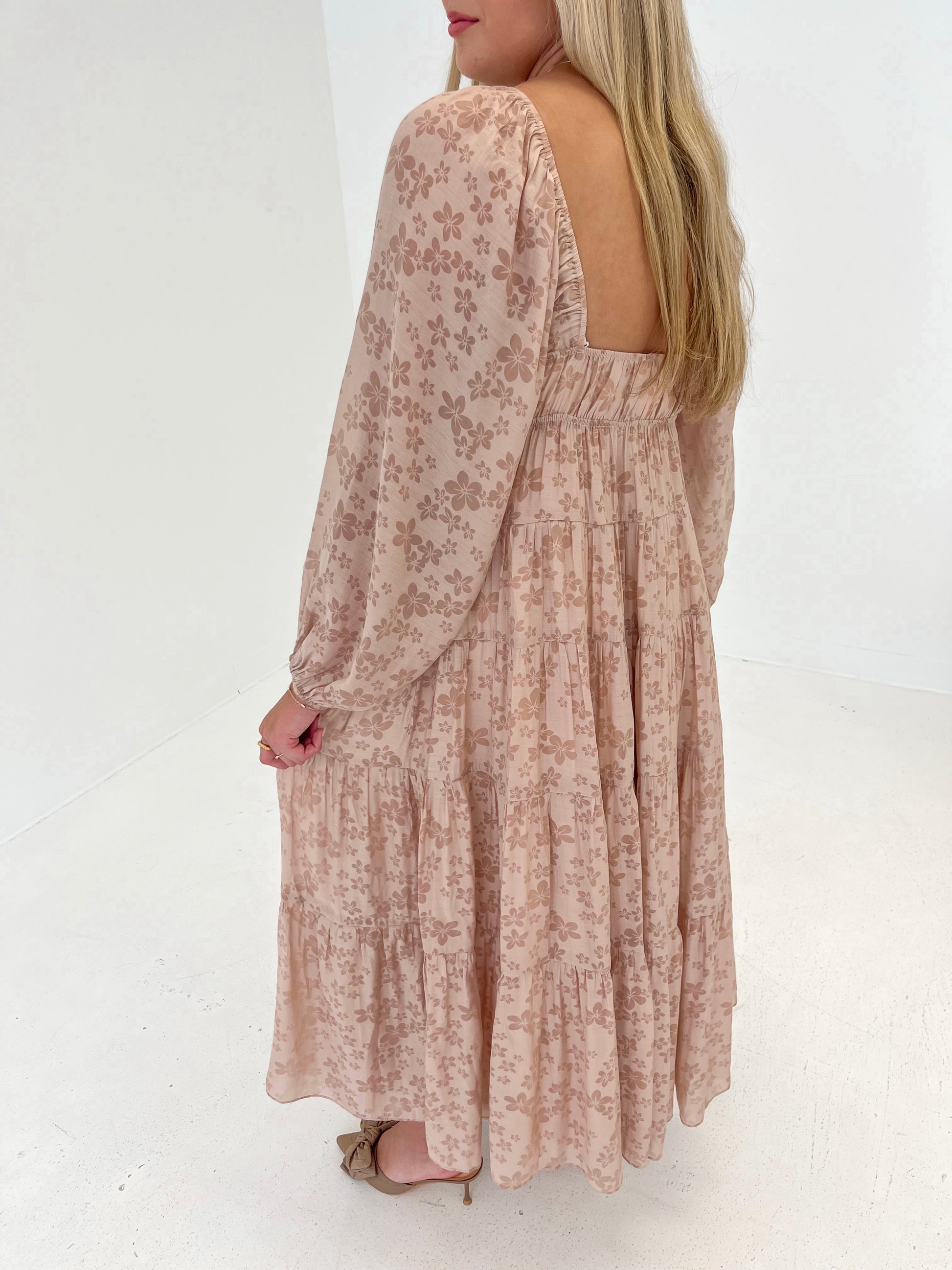 Floral smocked tiered long sleeve midi dress in color beige floral