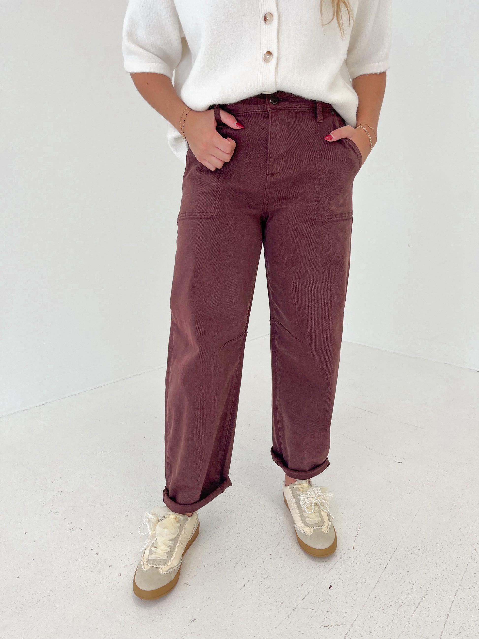 High rise ankle cuffed barrel jeans in color chocolate brown