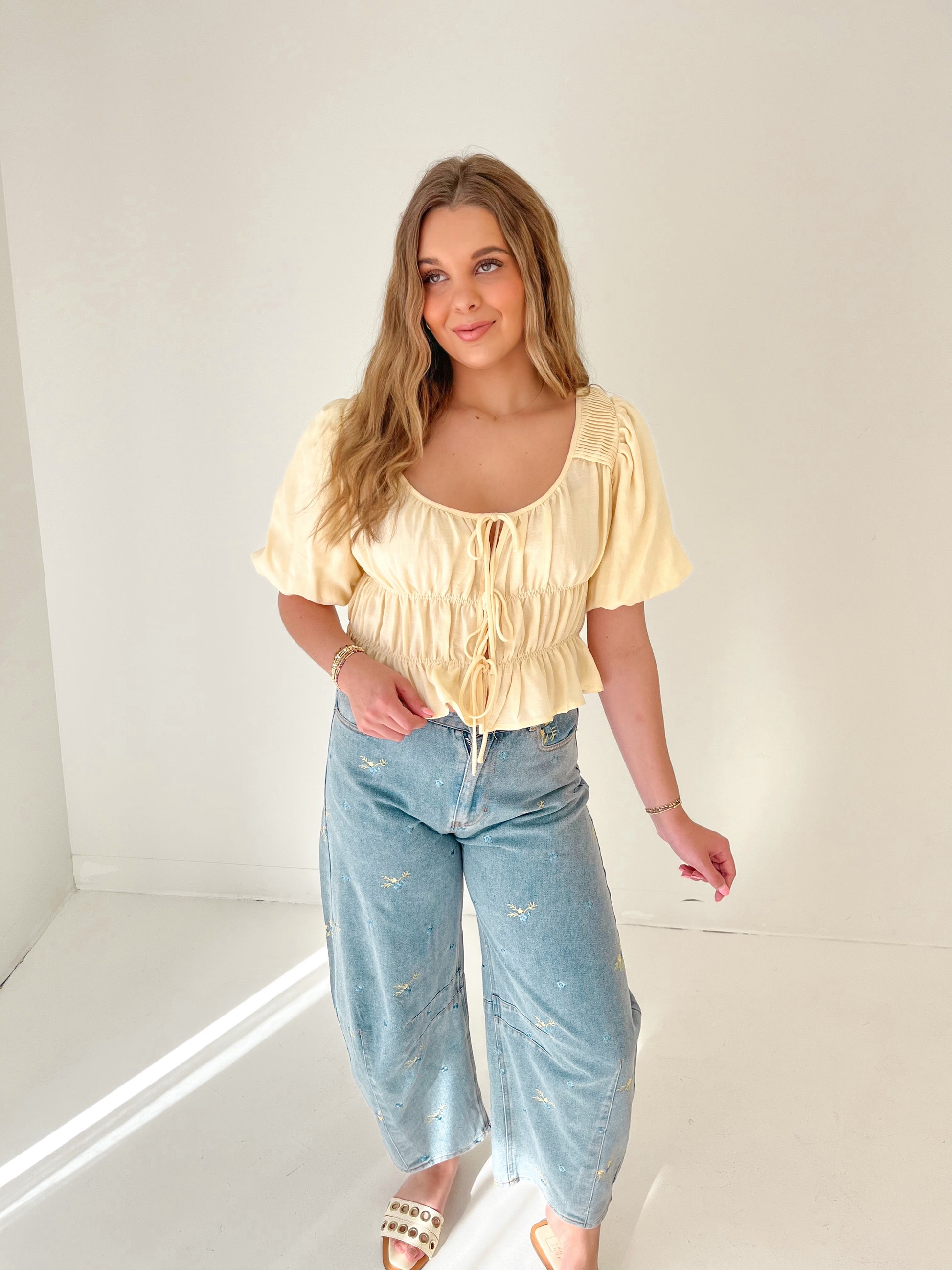Ruffled tie top with bubble sleeves in color light yellow