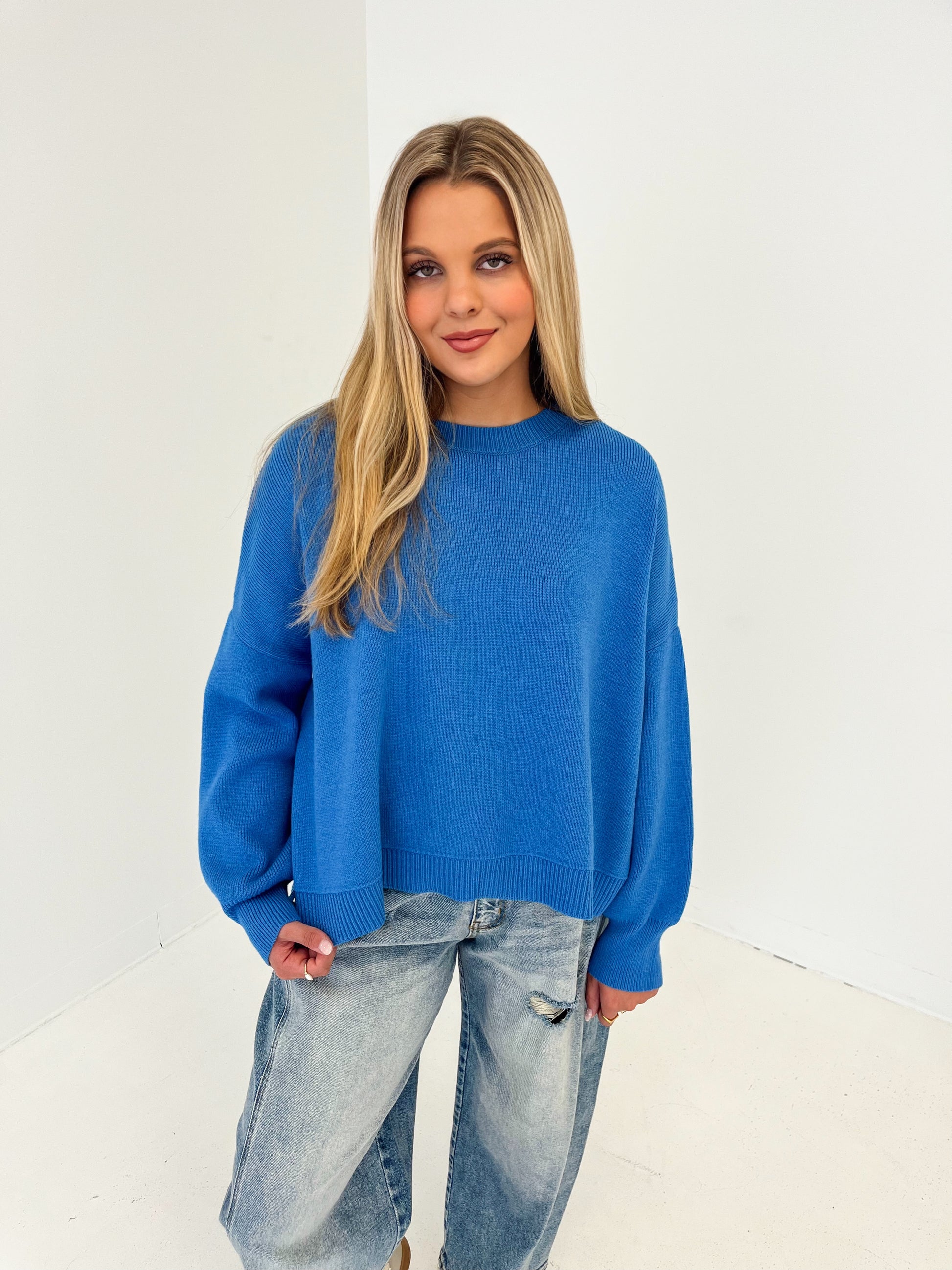 Drop shoulder sweater with side slits in color pacific blue