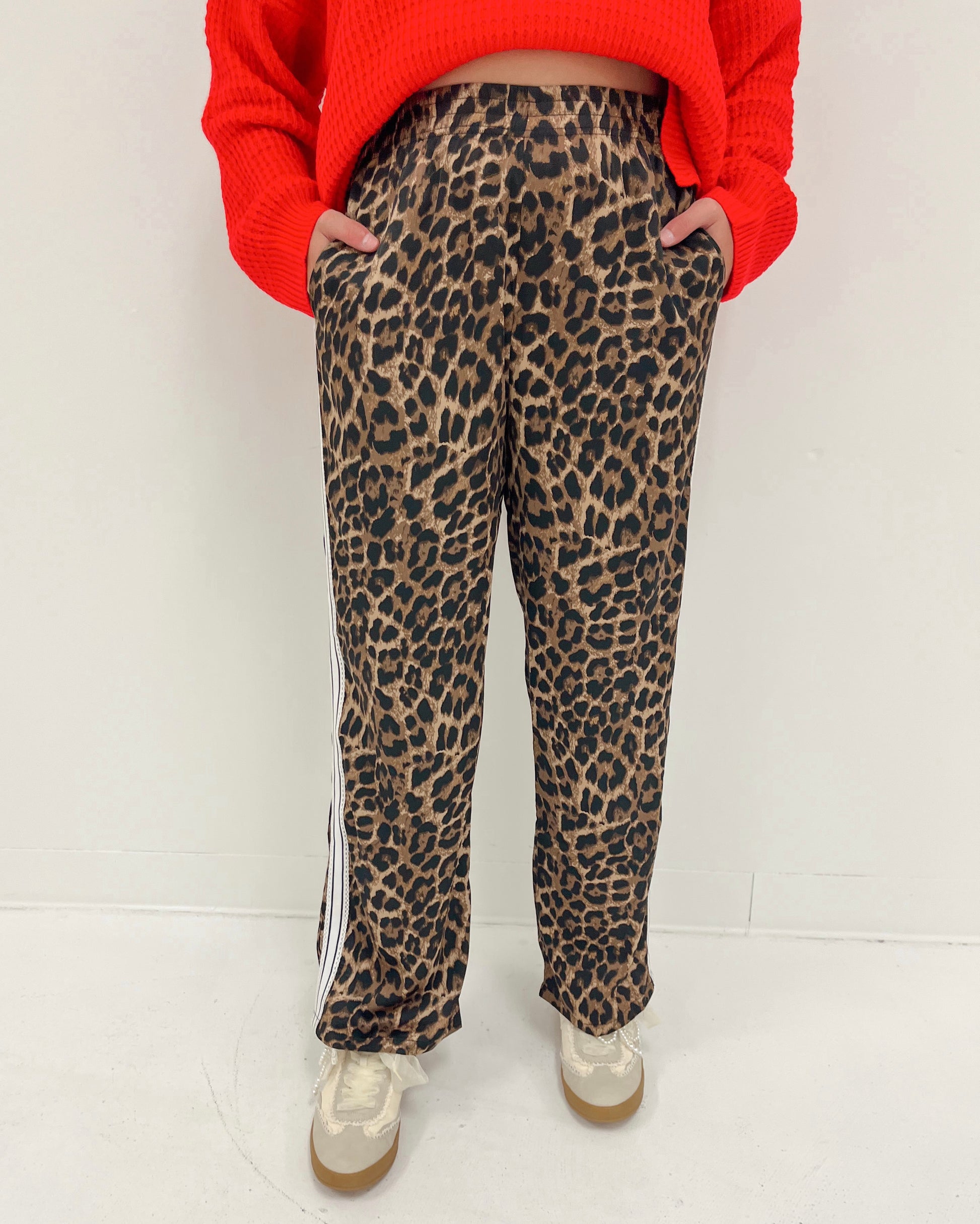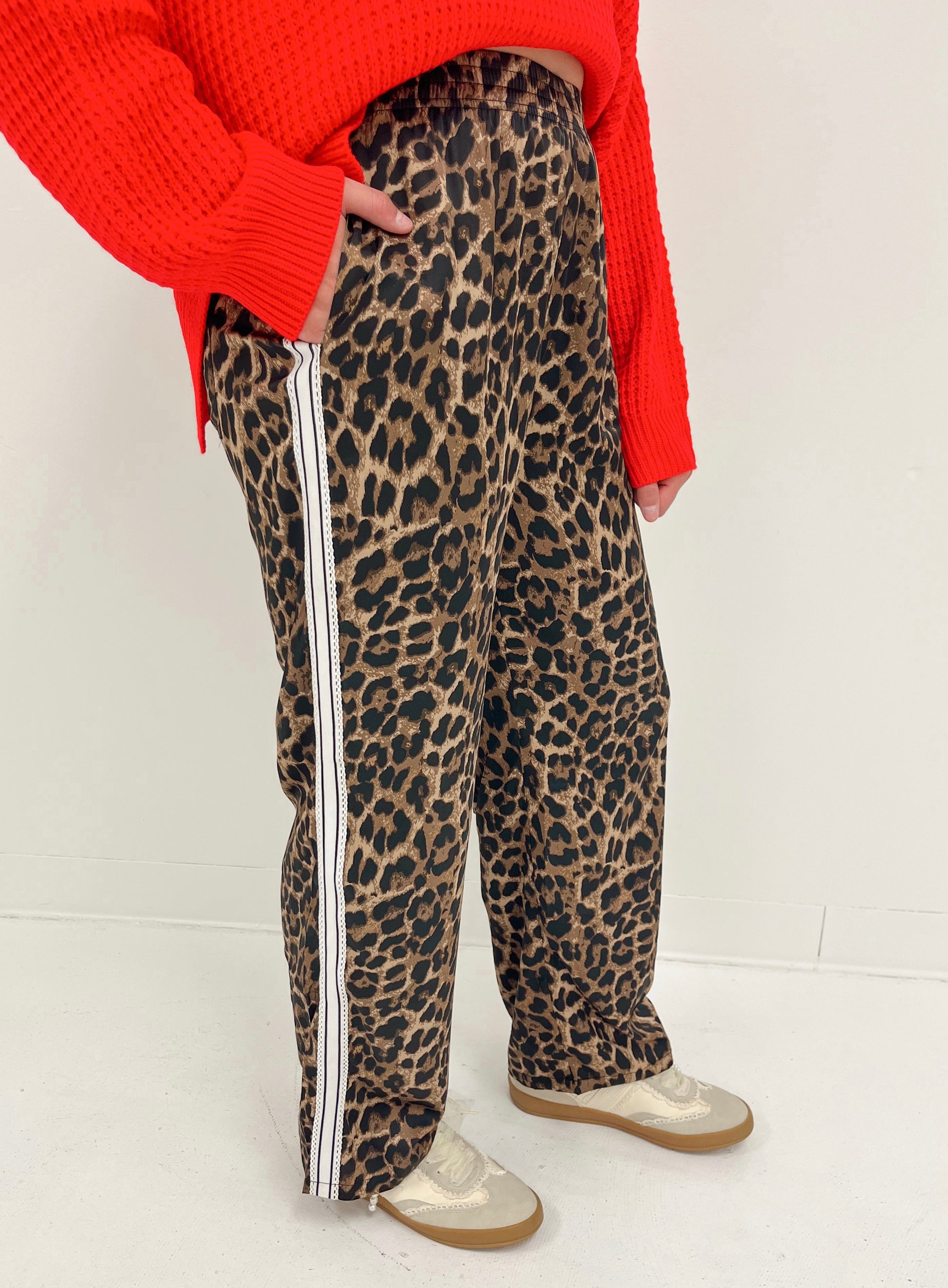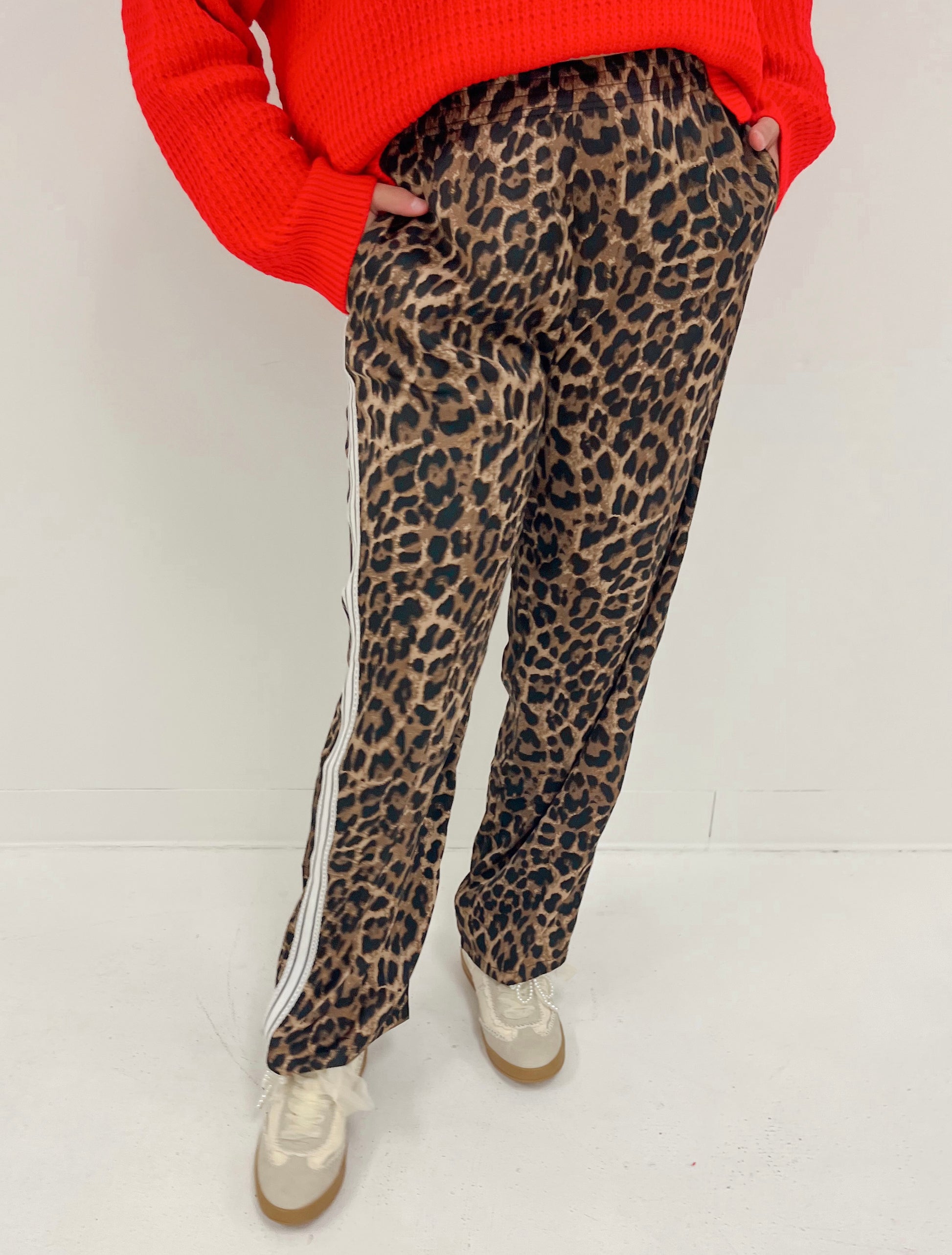 Leopard pants with elastic waistband & side pockets with side trim